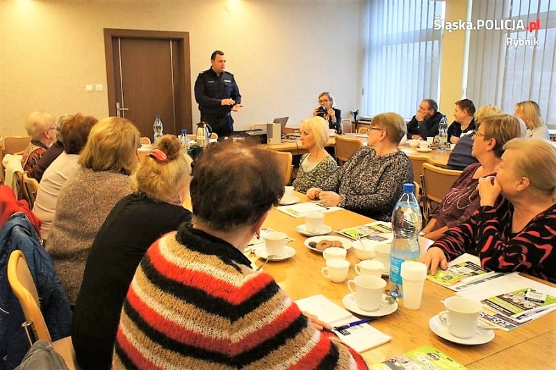 Reprezentujący rybnicką komendę, policjant Zespołu Prewencji Kryminalnej Nieletnich i Patologii sierż.szt. Dariusz Jaroszewski, rozmawiał z seniorami o bezpieczeństwie w miejscu zamieszkania oraz w miejscu publicznym. Policjant omówił poszczególne kategorie przestępstw, których ofiarami często padają osoby starsze - oszustwa „na wnuczka”, „na policjanta”, kradzieże kieszonkowe. Profilaktyk przestrzegał również seniorów przed domokrążcami oferującymi do sprzedaży tanie towary oraz osobami podającymi się za urzędników i przedstawicieli różnych instytucji. Bowiem często zdarza się, że oszuści „podszywając się” za pracowników opieki społecznej, urzędu skarbowego czy ZUS-u twierdzą, że ich wizyta w mieszkaniu seniora spowodowana jest wypłatą dodatkowego świadczenia pieniężnego lub materialnego, przyznaniem większej emerytury lub renty, czy zwrotem podatku dochodowego, a w celu uzyskania tych pieniędzy lub świadczeń konieczne jest wniesienie opłaty manipulacyjnej lub przekazanie pieniędzy na zakup znaczków skarbowych. Takie działanie sprawcy ma na celu wskazanie miejsca, gdzie przechowywane są pieniądze. Następnie złodziej prosi o podanie np. szklanki wody, a w międzyczasie kradnie oszczędności lub cenne przedmioty znajdujące się w mieszkaniu.
