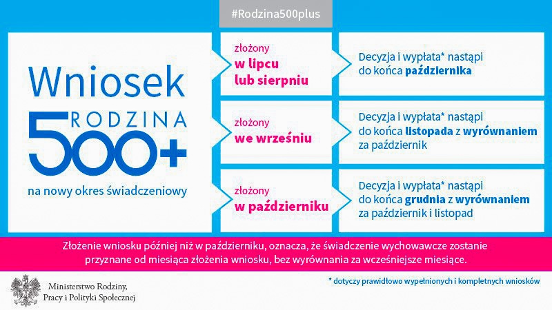 Złożenie kompletnego i prawidłowo wypełnionego wniosku w lipcu lub w sierpniu daje gwarancję ciągłości otrzymywania świadczenia. W praktyce oznacza to, że przyznanie świadczenia wychowawczego oraz wypłata przyznanego świadczenia za październik nastąpi do 31 października tego roku.
