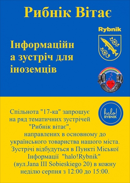 5 sierpnia 2018 roku w halo!Rybnik odbędzie się pierwsze spotkanie mające na celu integrację obywateli Ukrainy z Rybniczanami. Pomysłodawca inicjatywy, Stowarzyszenie 17-tka, przy współpracy Powiatowego Urzędu Pracy w Rybniku, Urzędu Miasta Rybnika oraz Ośrodka Pomocy Społecznej w Rybniku, w ramach Klubu Ukraińskiego chce zapoznać Ukraińców z planem miasta i powiatu rybnickiego, komunikacją miejską, placówkami kulturalnymi. W spotkaniach będą uczestniczyć przedstawiciele z innych placówek, by zapoznać ich z takimi tematami, jak na przykład poszukiwanie ofert pracy, załatwianie meldunku, numeru pesel, świadczeń pomocowych.