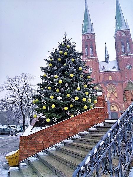 Dzielnica Paruszowiec-Piaski - przy przedszkolu (choinka stawiana przez dzielnicę, a dekorowana przez Zarząd Zieleni Miejskiej (oświetlona)