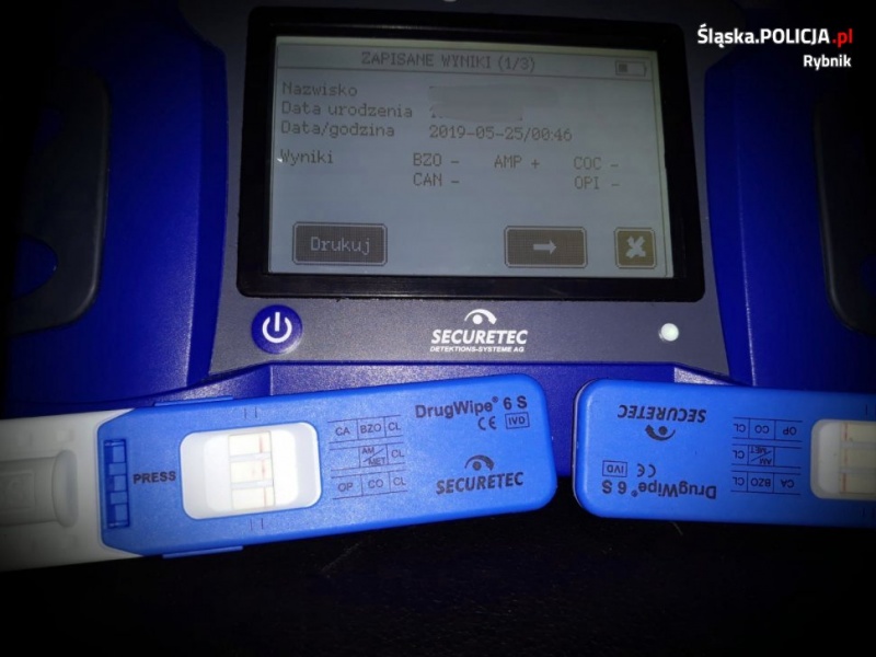 Policjanci z rybnickiej drogówki korzystają na co dzień, poza sprzętem do szybkiego badania na zawartość alkoholu, także z nowoczesnych urządzeń do wykrywania narkotyków w organizmie. Urządzenia Drug Read w bardzo krótkim czasie weryfikują, czy kontrolowana osoba zażywała wcześniej środki odurzające. Tak też było w tym przypadku. Po przeprowadzeniu badania kierowcy okazało się, że prowadził on samochód będąc pod wpływem amfetaminy.