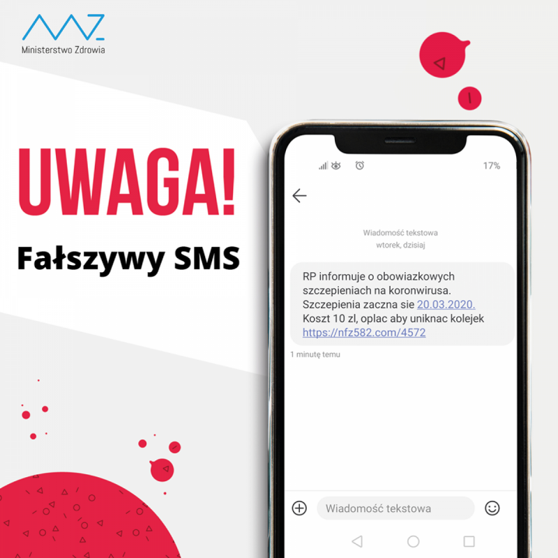 Ministerstwo Zdrowia nie wysyła żadnych SMS-ów dotyczących obowiązkowych szczepień na koronawirusa i nakłaniających do płatności. Prosimy nie klikać w przesłane linki! - informuje resort zdrowia.