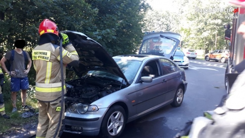 Spod maski samochodu osobowego marki BMW, którym podróżował 20-letni mieszkaniec Rybnika, zaczął wydobywać się dym. Szybko pojawił się też ogień. Z pomocą ruszyli przypadkowi kierowcy, którzy przejeżdżali obok tego zdarzenia. We właściwym miejscu i czasie pojawili się również policjanci z rybnickiej drogówki, którzy przejeżdżali ulicą Mikołowską. Mundurowi przy użyciu gaśnicy zaczęli gasić pożar.