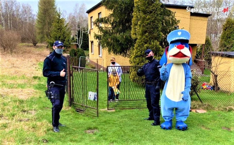 Rybniccy mundurowi codziennie kontrolują osoby objęte kwarantanną domową. Bardzo często wśród nich są również dzieci. Dla najmłodszych widok radiowozu, czy policjanta, to często atrakcja dnia. Policjanci postanowili umilić czas spędzany na kwarantannie 7-letniemu Bartkowi i odwiedzili go wraz z maskotką Śląskiej Policji - Sznupkiem. Mundurowi przekazali chłopcu drobne upominki, wśród których znalazła się maskotka, gra planszowa, plan lekcji, torba, koszulka oraz kubek. Nietypowa wizyta wywołała niemałe zaskoczenie i sprawiła dziecku wiele radości.
