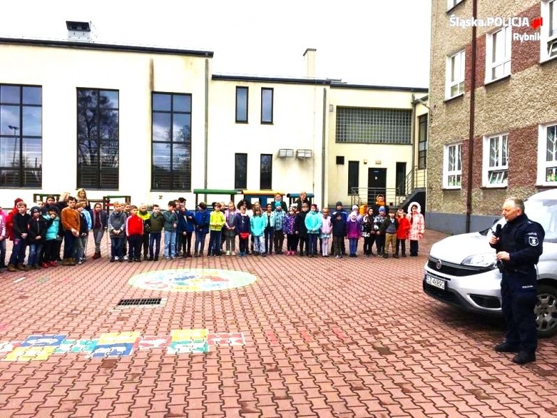 Stróże prawa omówili z uczniami szkoły podstawowe zasady, jakie obowiązują w ruchu drogowym, przypomnieli o obowiązkowym zapinaniu pasów i noszeniu odblasków. Mundurowi poświęcili też wiele uwagi prawidłowemu przechodzeniu przez jednię i apelowali do dzieci, aby te zachowywały szczególną ostrożność, przede wszystkim tam, gdzie nie ma wyznaczonych pasów dla pieszych, nawet gdy są pod opieką dorosłych. Podczas spotkania asp. Szymon Wieczorek - przewodnik psa służbowego z rybnickiej komendy omówił jak prawidłowo zachować się podczas kontaktu z nieznajomym psem. Ponadto mundurowi przekazali podstawowe informacje dotyczące obowiązków nałożonych na właścicieli czworonogów. Dzięki takim spotkaniom z policjantami, dzieci już od wczesnych lat życia kształtują umiejętności i nawyki bezpiecznego korzystania z dróg i bezpiecznego zachowania w różnych sytuacjach.