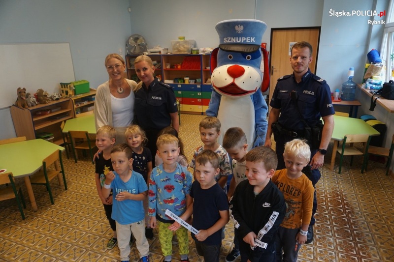 Rybniccy policjanci w ramach ogólnopolskiej akcji profilaktycznej "Kręci mnie bezpieczeństwo... nad wodą" spotkali się z dziećmi z Przedszkola nr 42 w Rybniku. Mundurowi podczas prowadzonej prelekcji przekazali najmłodszym podstawowe informacje dotyczące bezpiecznych zachowań podczas zabaw w domu, na podwórku oraz bezpieczeństwa w ruchu drogowym. Przy tej okazji, nie mogło również zabraknąć pluszowego policjanta ''Sznupka", z którym wszyscy wykonali sobie pamiątkowe zdjęcie.