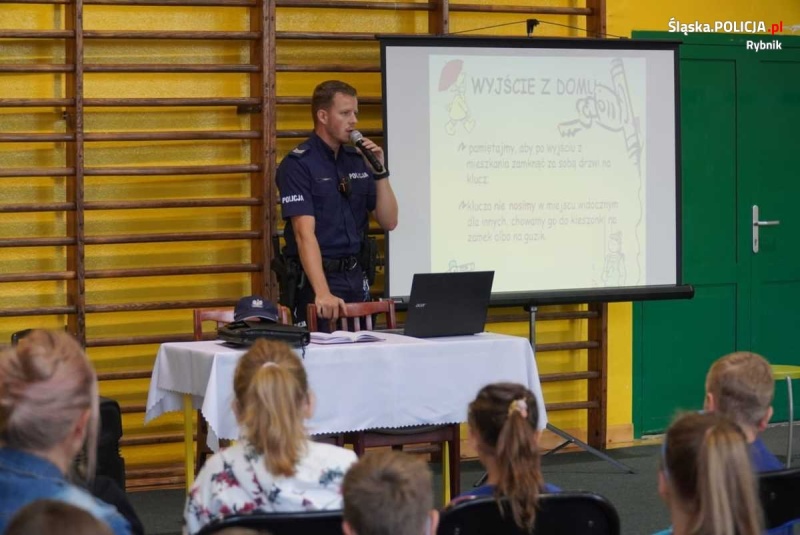 Rybnicki dzielnicowy podczas przedsięwzięcia przybliżył zasady bezpiecznego poruszania się po drodze, omówił zasady bezpieczeństwa w miejscach publicznych, a także opowiedział o tym, jak bezpiecznie poruszać się w sieci.