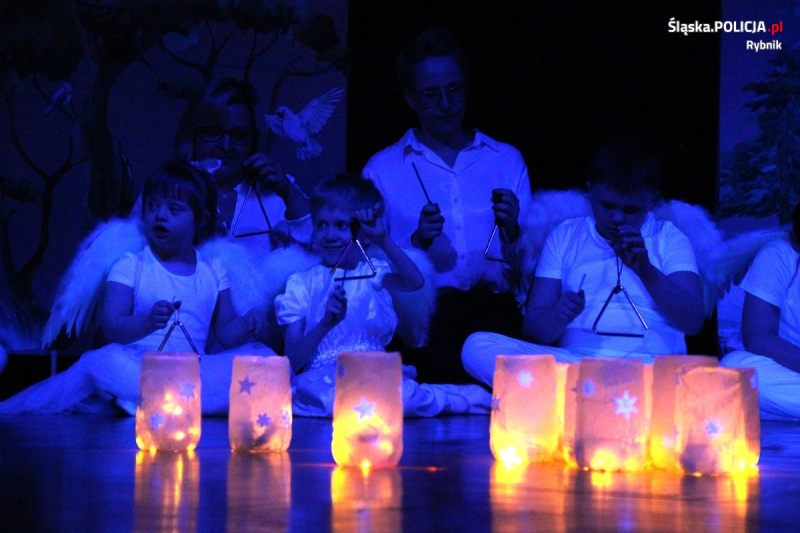 Zazwyczaj to mundurowi prezentują się różnym środowiskom. Przygotowują prezentacje, wystąpienia, przemowy. Często uczestniczą w wydarzeniach, w których można z bliska zobaczyć policyjny radiowóz i porozmawiać z nimi pod namiotem profilaktycznym. Takie przedsięwzięcia były organizowane również dla Szkoły Życia. Tym razem role się odmieniły. To policjanci oglądali przedstawienie, w którym wystąpiły dzieci z rybnickiej placówki. Jasełka zostały bardzo profesjonalnie przygotowane. Całość wywarła wielkie wrażenie na mundurowych, którzy mieli okazję z bliska podziwiać prezentowany spektakl. Wiele rekwizytów, kostiumów oraz olbrzymie zaaganżowanie dzieci sprawiły, że obecność na miejscu dawała ogromną radość. Tym wydarzeniem dzieci ze Szkoły Życia udowodniły jak świetnie potrafią przygotować się i zrealizować trudne zadania, ponieważ wystąpienie przed publicznością nigdy nie jest łatwe.