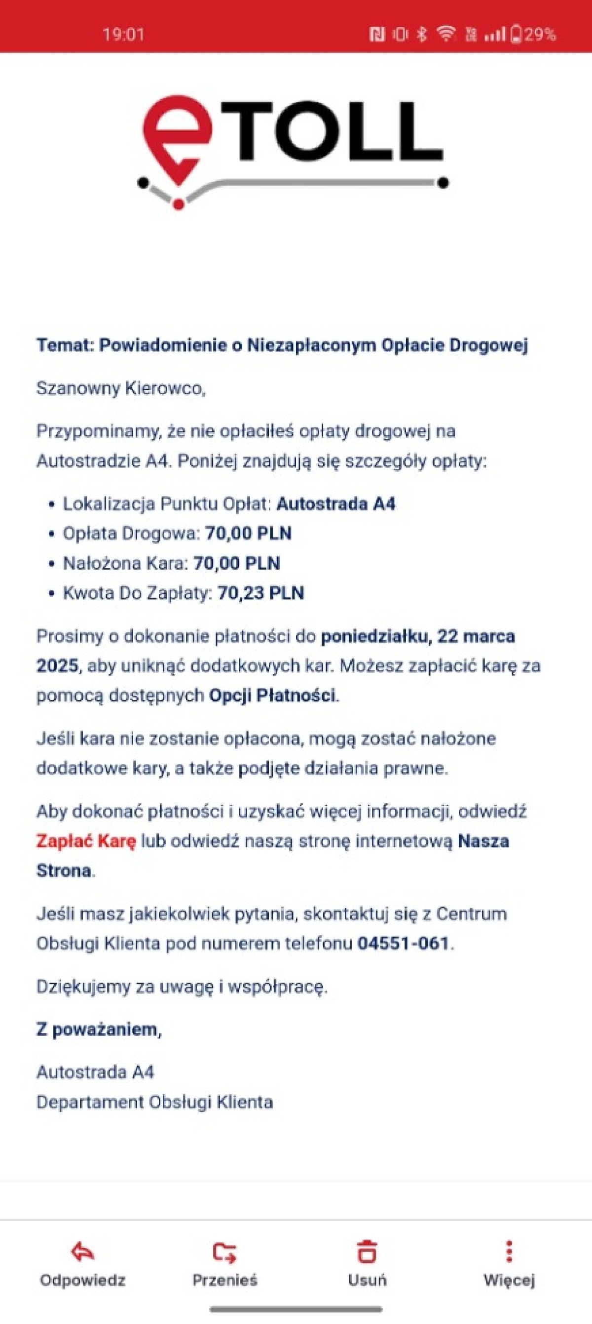 Ostrzegamy przed fałszywymi wiadomościami e-mail wzywającymi do uregulowania płatności za przejazd w systemie e-TOLL. Jest to próba wyłudzenia danych o rachunkach bankowych użytkowników. Jeżeli otrzymałeś e-mail z informacją o nieopłaconym przejeździe w e-TOLL, który zawiera logo systemu e-TOLL oraz link do płatności, zignoruj go i nie klikaj w link. Podane linki kierują do niebezpiecznych witryn.