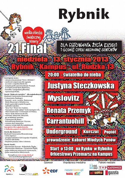 13 stycznia w Rybniku odbędzie się XXI Wojewódzki Finał Wielkiej Orkiestry Świątecznej Pomocy. W tym roku orkiestra gra dla ratowania życia dzieci i godnej opieki medycznej seniorów. Orkiestra Jurka Owsiaka to 9 godzin niezapomnianej zabawy w 4 strefach orkiestrowych: muzycznej, dobrych aniołów, nauki oraz dla seniorów.