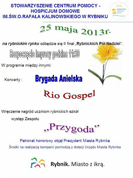 Tegoroczna akcja „Pola Nadziei” przebiegała w dwóch etapach: jesienią 2012 r. wolontariusze wraz z młodzieżą rybnickich szkół oraz pracownikami Zarządu Zieleni Miejskiej posadzili na terenie naszego miasta cebulki żonkili. Drugi etap akcji zaplanowano na sobotę, 25 maja br. Tego dnia odbędzie się finał Pól Nadziei. Główna impreza: happening, zabawy, koncerty (Brygada Anielska, Rio Gospel), występ zespołu "Przygoda", rozdanie nagród w konkursach itp. odbędzie się na rybnickim rynku w godz. od 11:00 do 16:30. Na ulicach miasta będą zaś kwestować wolontariusze. Honorowy patronat nad akcją objął Prezydenta Miasta Rybnika, Adam Fudali.