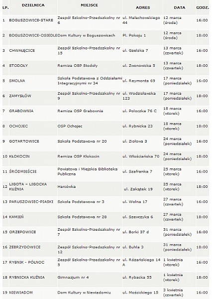 W środę, 12 marca, rozpocznie się cykl spotkań sprawozdawczych organizowanych co roku przez samorządy 27 rybnickich dzielnic. W trakcie spotkań, w których udział biorą także przedstawiciele władz miasta, podsumowywana jest działalność poszczególnych rad dzielnic. Spotkania w kolejnych rybnickich dzielnicach odbywają się zgodnie z przedstawionym harmonogramem. Sprawdź!