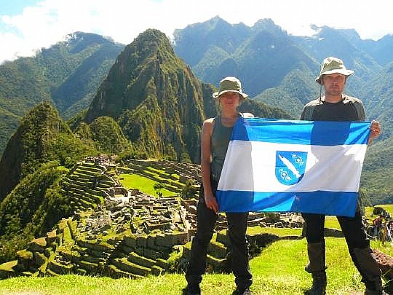 A tak flaga Rybnika prezentuje się na drugiej półkuli, na tle peruwiańskiego Machu Picc.