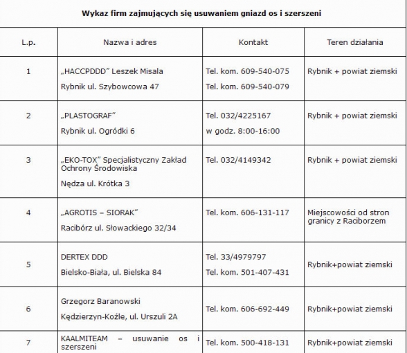 Standardowo usuwaniem w/w zagrożeń zajmują się firmy komercyjne, których wykaz znajduje się w poniższej tabeli: