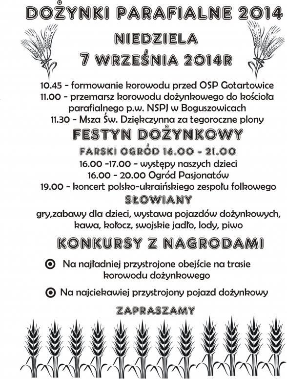 Dożynki parafialne odbędą się 7 września w Rybniku-Boguszowicach. W programie m.in przemarsz barwnego korowodu, wystepy dzieci, koncert zespołu folkowego, gry i zabawy oraz liczne konkursy. Więcej w poniższym plakacie.