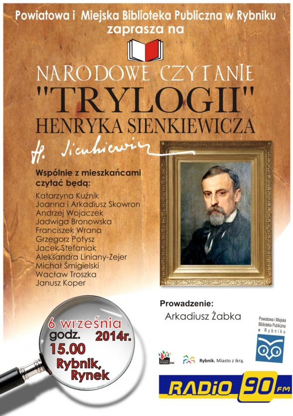 W tym roku lekturą ogólnopolskiej akcji jest „Trylogia” Henryka Sienkiewicza - dzieło przedstawiające obraz Polski różnorodnej i wielokulturowej, wyraz naszych narodowych tęsknot i marzeń, kronikę naszych militarnych oraz duchowych zwycięstw. Wśród czytających samorządowcy, ludzie kultury, dziennikarze. Do czytania zapraszamy także mieszkańców Rybnika i wszystkich zainteresowanych. Osoby, które przyjdą z egzemplarzami „Trylogii” będą mogły otrzymać w nich pamiątkową pieczęć. Inicjatorem i patronem „Narodowego Czytania” jest Prezydent RP Bronisław Komorowski. Patronem medialnym akcji w naszym mieście jest Radio 90.