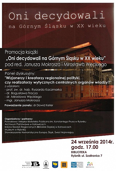 Zapraszamy na promocję książki „Oni decydowali na Górnym Śląsku w XX wieku” pod red. Janusza Mokrosza i Mirosława Węckiego, połączoną z panelem dyskusyjny zatytułowanym: "Wizjonerzy i kreatorzy regionalnej polityki, czy realizatorzy wytycznych centralnych organów władzy?" z udziałem: