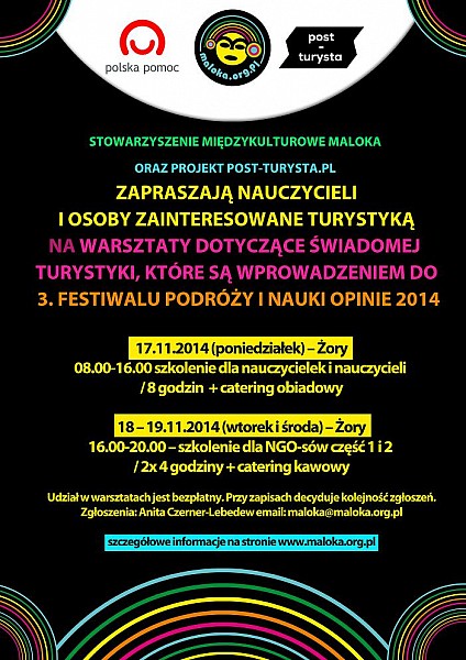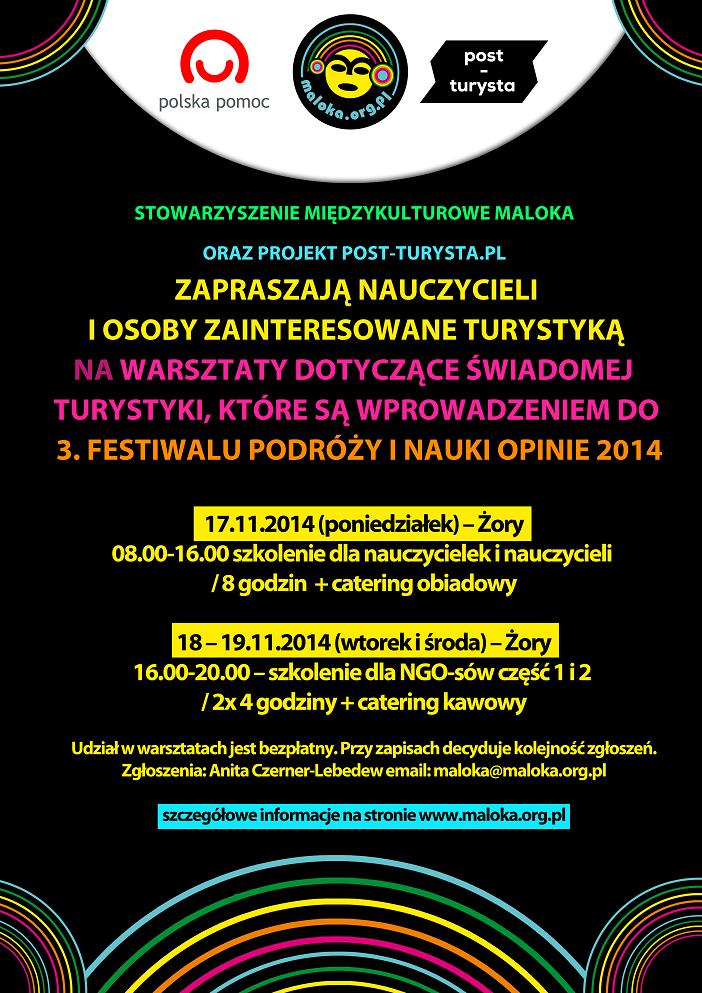 Stowarzyszenie Międzykulturowe Maloka oraz Projekt Post-Turysta.pl zapraszają nauczycieli i osoby zainteresowane turystyką na warsztaty dotyczące świadomej turystyki wprowadzające do 3. Festiwalu Podróży i Nauki OPINIE 2014
