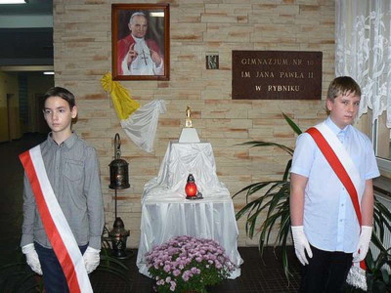 Od 19 do 24 listopada rybnickie Gimnazjum nr 10 im. Jana Pawła II w Ligocie-Ligockiej Kuźni gościło relikwie Jana Pawła II, które w ramach peregrynacji w archidiecezji katowickiej przekazywane są do 29 szkół imienia świętego papieża. Cenne sacrum odebraliśmy z gimnazjum w Leszczynach i po kilku dniach przekazaliśmy do gimnazjum w Żorach. Na noc relikwie przenoszono do kościoła Św. Wawrzyńca, gdzie 21 listopada odbyła się Msza Święta dziękczynna za kanonizację Jana Pawła II oraz wotywna w intencji uczniów, pracowników i rodziców.