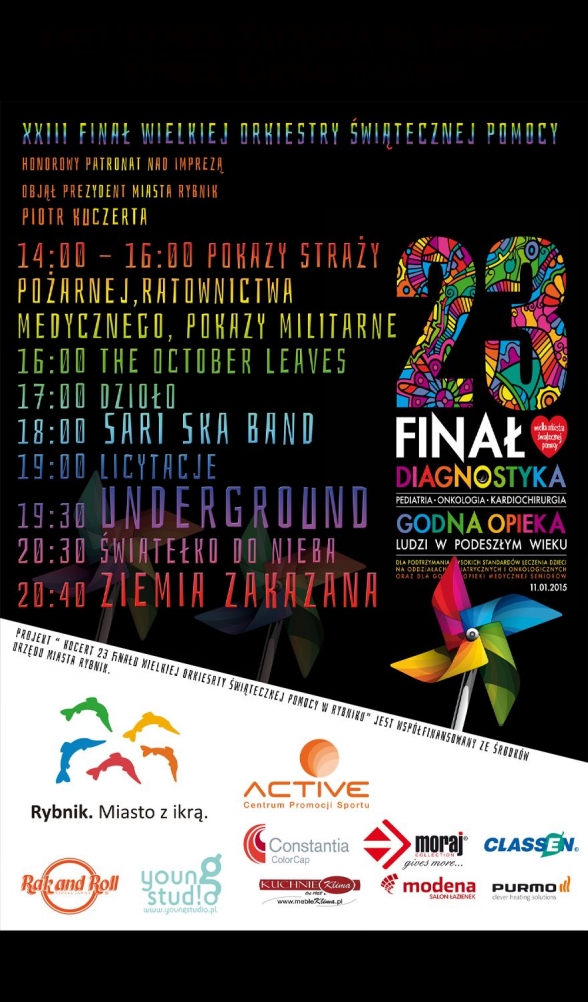 23. Finał WOŚP odbędzie się na studenckim kampusie, a honorowy patronat nad wydarzeniem objął prezydent miasta Rybnik Piotr Kuczera. W programie m.in. pokazy straży pożarnej, ratownictwa medycznego oraz pokazy militarne. Wieczór uświetnią koncert występy zespołów muzycznych: „The October leaves”, „Dzioło”, „Sari Ska Band”, „Underground” i „Ziemia Zakazana”. O 20.30 odbędzie się tradycyjne już „Światełko do nieba”.