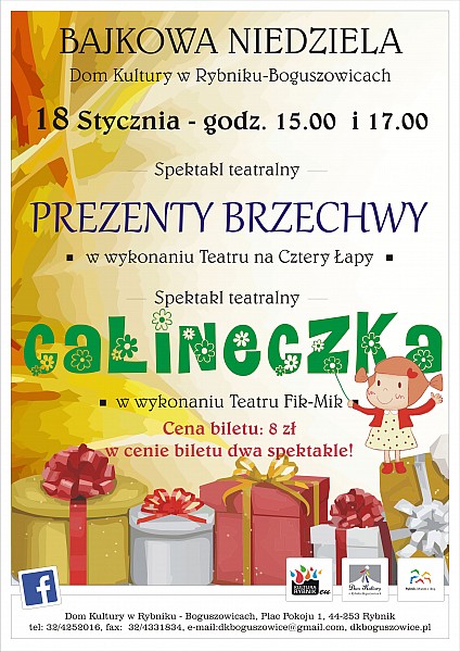 Dom Kultury w Rybniku-Boguszowicach zaprasza 18 stycznia na pierwszą w nowym roku Bajkową Niedzielę. Zaprezentujemy dwa przedstawienia dla dzieci: „Calineczka” w wykonaniu Teatru Na Cztery Łapy ze Szkoły Podstawowej w Marklowicach oraz „Prezenty Brzechwy” w wykonaniu Teatru FIK-MIK z naszego domu kultury. Spektakle o godzinie 15.00 oraz 17.00.
