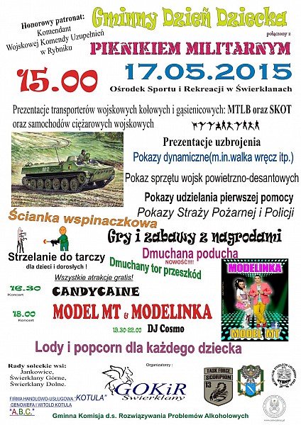 Zapraszamy serdecznie wszystkich mieszkańców – młodszych i starszych, na Gminny Dzień Dziecka, który połączony zostanie z piknikiem militarnym. Impreza plenerowa odbędzie się w niedzielę 17 maja na terenie Ośrodka Sportu i Rekreacji w Świerklanach. Startujemy o godz. 15.00. Szczegółowy program pikniku – poniżej.