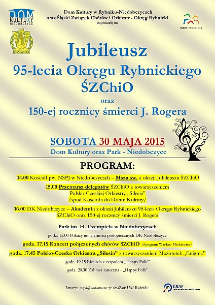 W ramach obchodów Jubileuszu na godzinę 14.00 w niedobczyckiem Kościele pw. NSPJ zaplanowano mszę świętą, a następnie przemarsz delegatów Śląskiego Związku Chórów i Orkiestr z towarzyszeniem Polsko-Czeskiej Orkiestry "Silesia" - spod Kościoła do Domu Kultury w Niedobczycach. O godzinie 16.00 w DK odbędzie się uroczysta Akademia. Zaplanowaną także drugą część imprezy, która odbędzie się w Parku im. H. Czempiela w Niedobczycach. O godzinie 17.15 na scenie zaprezentują się połączone chóry ŚZChiO pod przewodnictwem dyrygenta okręgowego Wacława Mickiewicza, zaś pół godziny później Polsko-Czeska Orkiestra "Silesia" z towarzyszeniem Mażoretek "Enigma". Uroczystość ma na celu uczczenie pamięci "śląskiego Kolberga" - Juliusza Rogera. Ten wybitny i oddany społecznik oraz lekarz, jako miłośnik folkloru śląskiego zapisał nutami kilkaset (546) ludowych melodii z naszego regionu, przez co uchronił je od zapomnienia. Utwory zostały wydane pod tytułem "Pieśni ludu polskiego na Górnym Śląsku" (1863 r.). Ten Niemiec dla lepszych kontaktów z ludnością, nauczył się języka polskiego. Niezależnie od muzycznej pasji, jako nadworny lekarz książęcy ratował ludzi chorych m.in. na gruźlicę. Wybudował kilka szpitali, z których szpital w Pilchowicach do tej pory służy chorym, specjalizując się w leczeniu chorób płuc. Zmarł nagle w 1865 roku w czasie polowania w lasach raciborskich - obiegowa opinia głosi, że przypadkowo został postrzelony przez niedowidzącego księcia Wiktora I. W miejscu tragicznej śmierci - w lesie między Kozłowem a Rachowicami w powiecie gliwickim - znajduje się obelisk upamiętniający to wydarzenie. Dr Roger pochowany został w niedalekich Rudach k. Raciborza. Tam też stoi pomnik jemu poświęcony. Gdy w latach 90-tych ubiegłego wieku, z inicjatywy wybitnego działacza PZChiO, Waltera Stryi, w ośrodku rekreacyjnym "Buk" w Rudach odbywały się jesienne Zloty Śląskich Chórów i Orkiestr, w repertuarze występujących chórów znajdowały się pieśni zapisane przez Rogera. Impreza połączona jest z Festynem z okazji Dnia Dziecka. Organizatorzy serdecznie zapraszają.