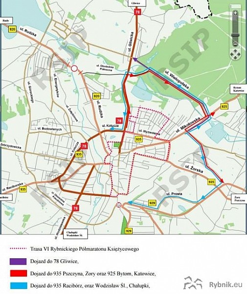 rondo Gliwickie, ul. Gliwicka (DK 78), rondo Europejskie ul. Obwiednia Północna, rondo Larissa, ul. Wielopolską, ul. Mikołowską (DW 925), ul. Przemysłową, ul. Karola Miarki do ulicy Prostej (DW 935), - dojazd do DW 935 – Racibórz oraz Chałupki, Wodzisław Śl.: ul. Mikołowską (DW 925), ul. Wielopolską, rondo Larissa, ul. Obwiednia Północna, rondo Europejskie, ulicą Gliwicką (DK 78), rondo Gliwickie do ulicy Kotucza (DK 78),