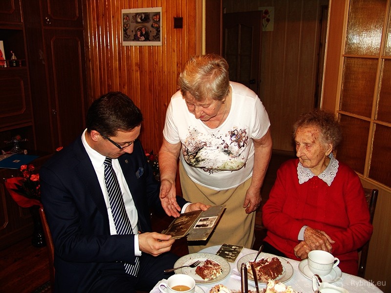 Podczas okolicznościowego spotkania prezydent przekazał jubilatce życzenia oraz tradycyjnie kwiaty i upominki. Spotkanie było oczywiście okazją do snucia wspomnień. Pani Jadwiga urodziła się w niemieckim Bottrop. Kiedy miała 9 lat, jej pochodzący z Raciborza (znajdującego się wtedy w granicach Niemiec) rodzice przyjechali do Rybnika, by wziąć udział w plebiscycie. Opowiedzieli się za Polską i zamieszkali w Zebrzydowicach.