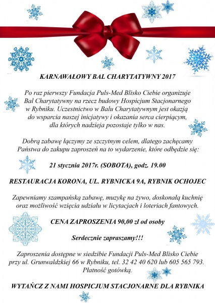 Karnawałowy Bal Charytatywny odbędzie się 21 stycznia w restauracji Korona w Rybniku. Bilety można nabyć w siedzibie Fundacji Puls-Med Blisko Ciebie przy ul. Grunwaldzkiej 66 w Rybniku (osiedle Nowiny). Na terenie Rybnika trudno o profesjonalną pomoc dla chorych w stanie terminalnym. Działające w mieście dwa hospicja domowe nie są w stanie zająć się wszystkimi potrzebującymi.