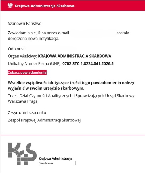 Apel Krajowej Administracji Skarbowej. Oszuści podszywający się pod Krajową Administrację Skarbową (KAS) i urzędy skarbowe wysyłają fałszywe maile z wezwaniami i powiadomieniami. Prosimy sprawdzać dokładnie adresy, z których przychodzą wiadomości. Jeśli otrzymałeś podejrzaną wiadomość e-mail albo masz wątpliwości co do jej autentyczności, skontaktuj się z infolinią KAS: 22 330 03 30 lub najbliższym urzędem skarbowym.