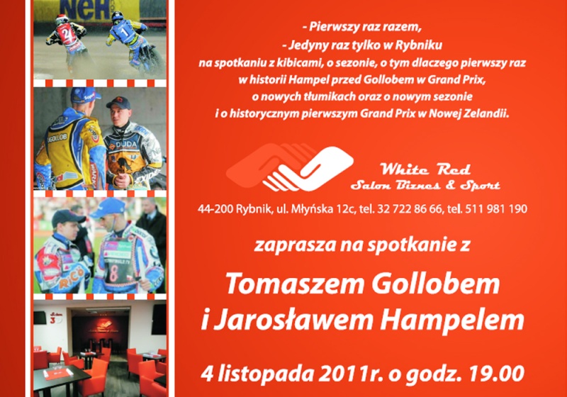 4 listopada (piątek) o godzinie 19:00 w restauracji White Red w Rybniku (ul. Młyńska 12c) odbędzie się jedyne w swoim rodzaju spotkanie Tomasza Golloba i Jarosława Hampela. Zawodnicy po raz pierwszy wystąpią razem.