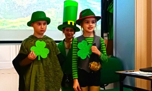 Ponadto Mark nauczył nas ludowej piosenki o Molly sprzedającej małże. Po prelekcji pana Marka uczennice klasy 6c i 6a wykonały taniec irlandzki. Taniec tak bardzo się spodobał, że podczas gier i zabaw o Irlandii prowadzonych przez panią Marzenę Kuś prawie wszyscy uczniowie chcieli wziąć udział w konkursie stepowania. Równie dużym zainteresowaniem cieszyły się inne konkursy i zabawy: układanie piramidy ze złotych monet, wypowiadanie życzenia dla Leprechuna, mnemotechniki o kolorach tęczy, zagadki o krasnalach w polskich miastach, pytania o irlandzkie instrumenty muzyczne oraz rybnickie zespoły irlandzkie, i wiele, wiele innych. Po tych wszystkich atrakcjach uczniowie mogli sprawdzić zdobytą wiedzę o szmaragdowej wyspie w quizie Kahoot.