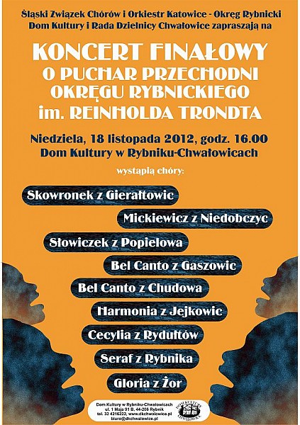 Skowronek z Gierałtowic, Mickiewicz z Niedobczyc i Słowiczek z Popielowa - to tylko niektóre chóry, jakie wystąpią podczas koncertu finałowego o Puchar Przechodni Okręgu Rybnickiego im. Reinholda Trondta. Koncert odbędzie się w niedzielę w Domu Kultury Rybnik-Chwałowice. Początek o godz. 16.00.