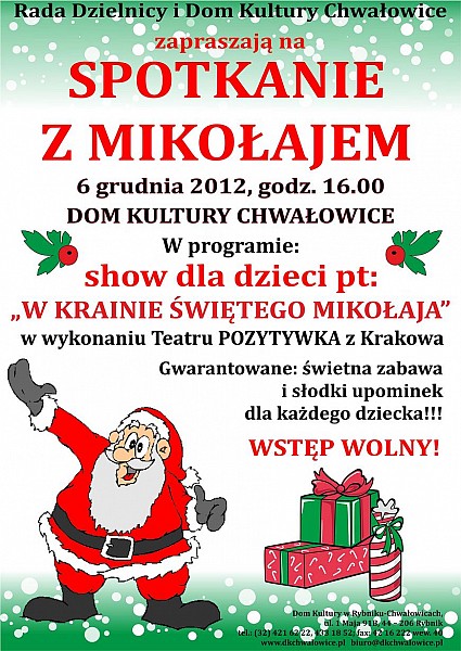 Świetna zabawa i słodki upominek dla każdego dziecka - takie atrakcje czekają na dzieci podczas spotkania ze Świętym Mikołajem. Rada dzielnicy i Dom Kultury Rybnik-Chwałowice zapraszają wszystkie dzieci na spotkanie 6 grudnia. Początek o godz. 16.00. Wstęp wolny.