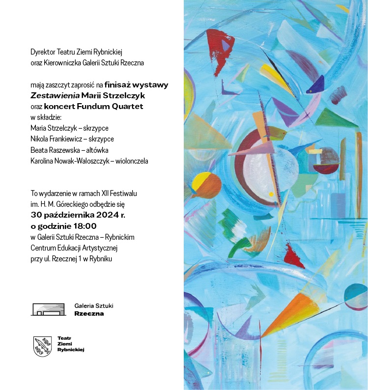 Dyrektor Teatru Ziemi Rybnickiej oraz kierownik Galerii Sztuki Rzeczna w Rybniku serdecznie zapraszają na wyjątkowe wydarzenie artystyczne, jakim jest finisaż wystawy malarstwa Marii Strzelczyk pt. „Zestawienia” oraz towarzyszący mu koncert w wykonaniu Fundum Quartet.
