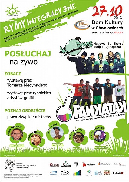 27 października (niedziela) od godz. 18.00 Stowarzyszenie Zielone Światło z Rybnika we współpracy z Domem Kultury Chwałowice zrealizuje swój pierwszy event pt. "RYMY INTEGRACYJNE".