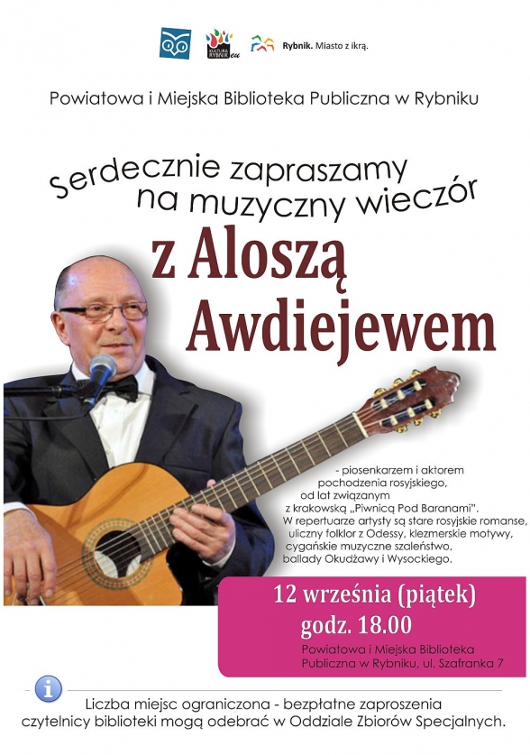 Serdecznie zapraszamy na muzyczny wieczór z Aloszą Awdiejewem - piosenkarzem i aktorem pochodzenia rosyjskiego, od lat związanym z krakowską „Piwnicą Pod Baranami”. W repertuarze artysty są stare rosyjskie romanse, uliczny folklor z Odessy, klezmerskie motywy, cygańskie muzyczne szaleństwo, ballady Okudżawy i Wysockiego.