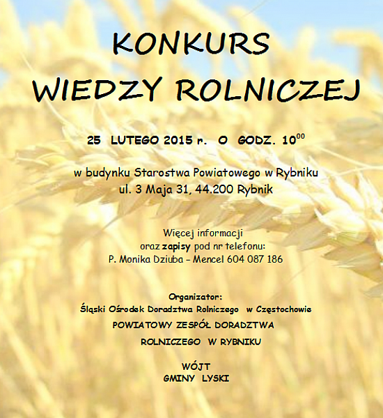 Śląski Ośrodek Doradztwa Rolniczego w Częstochowie, Powiatowy Zespół Doradztwa Rolniczego w Rybniku oraz wójt gminy Lyski organizują konkurs wiedzy rolniczej. Odbędzie się on 25 lutego o godz. 10.00 w budynku Starostwa Powiatowego w Rybniku. Szczegóły na plakacie w poniższym załączniku.