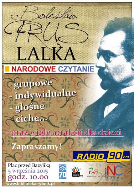 Rybnik: Zapraszamy do udziału w Narodowym Czytaniu - ogólnopolskiej akcji pod patronatem Prezydenta RP. Spotykamy się 5 września o godz. 10.00 na Placu przed Bazyliką, by wspólnie czytać "Lalkę". "Lalka" Bolesława Prusa to jedna z najwybitniejszych i najważniejszych polskich powieści. Zapraszamy do wspólnego czytania na wiele sposobów: głośno, cicho, grupowo, indywidualnie. Z okazji Narodowego Czytania przygotowaliśmy także wiele atrakcji dla dzieci.
