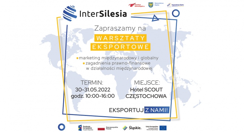Przed nami kolejna edycja warsztatów eksportowych realizowanych w ramach projektu InterSilesia. Szkolenie odbędzie się w dniach 30-31.05.2022 r. w Hotelu Scout sp. z o.o., przy ul. Drogowców 12 w Częstochowie.