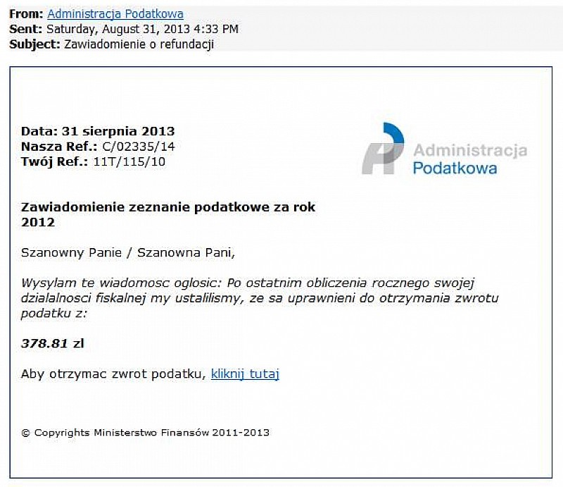 Forma informacji wskazuje, że została ona sporządzona przez osobę niewładającą poprawnie językiem polskim i ma na celu wyłudzenie od adresatów e-maili ich danych poprzez próbę przekierowania użytkownika internetu do podrobionej strony WWW (tzw. phishing). Ministerstwo Finansów rozważa możliwość złożenia doniesienia do prokuratury o popełnieniu przestępstwa. Na załączonym zdjęciu przykład fałszywego e-maila.