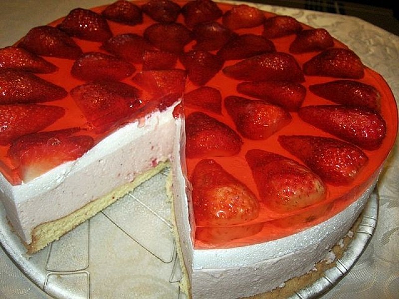 Galaretkę rozpuścić w gorącej wodzie,odstawić aż zacznie gęstnieć. Truskawki przekroić na połowę,ułożyć na torcie i zalać gęstniejącą galaretką.