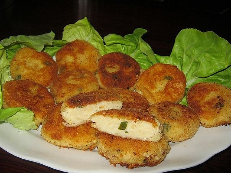 Ziemniaki ugotować w osolonej wodzie,ostudzić i wraz z serem przecisnąć przez praskę. Cebulkę pokroić w kosteczkę i poddusić na oleju. Wszystko razem zagnieść,dodając jajko i posiekaną zieloną cebulkę. (Gdyby masa była zbyt rzadka,wtedy dosypać trochę bułki tartej) Całość doprawić solą i pieprzem,formować niewielkie kotlety Każdy kotlecik panierować w jajku i bułce tartej,smażyć na gorącym oleju. Smak kotlecików można zmieniać,dodając posiekanego koperku lub sera rokpol.