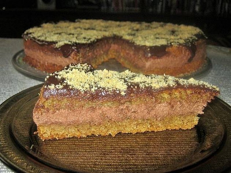 Zimne ciasto przekroić na pół ,przełożyć kremem,przykryć i polać dodatkową roztopioną czekoladą. Całość posypać mielonymi orzechami.