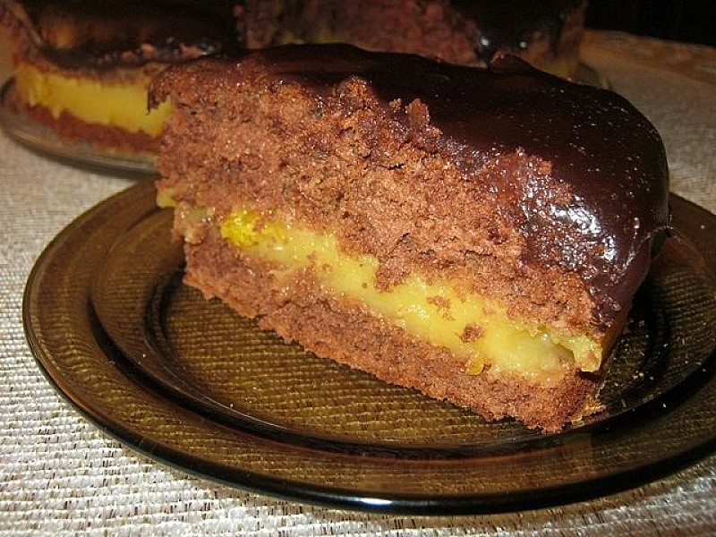 Zimne ciasto przekroić na 3 placki. Pierwszy placek nasączyć sokiem pomarańczowym, nałożyć na górę masę pomarańczową, przykryć drugim plackiem (który również nasączyć sokiem) i nałożyć masę czekoladową. Całość przykryć ostatnim plackiem, nasączyć i oblać letnią polewą. Odstawić do lodówki na parę godzin.