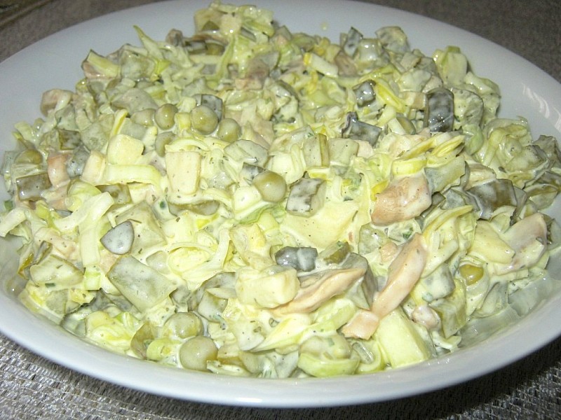 Jasną cześć pora pokroić w półplasterki i sparzyć na sicie, po czym szybko przelać zimną wodą i odstawić aż do odsączenia. Ogórki pokroić w małą kosteczkę następnie wraz z pieczarkami i groszkiem również odsączyć na sicie. Ser i jabłko pokroić w drobną kosteczkę, dodać odsączony por oraz pozostałe składniki.
