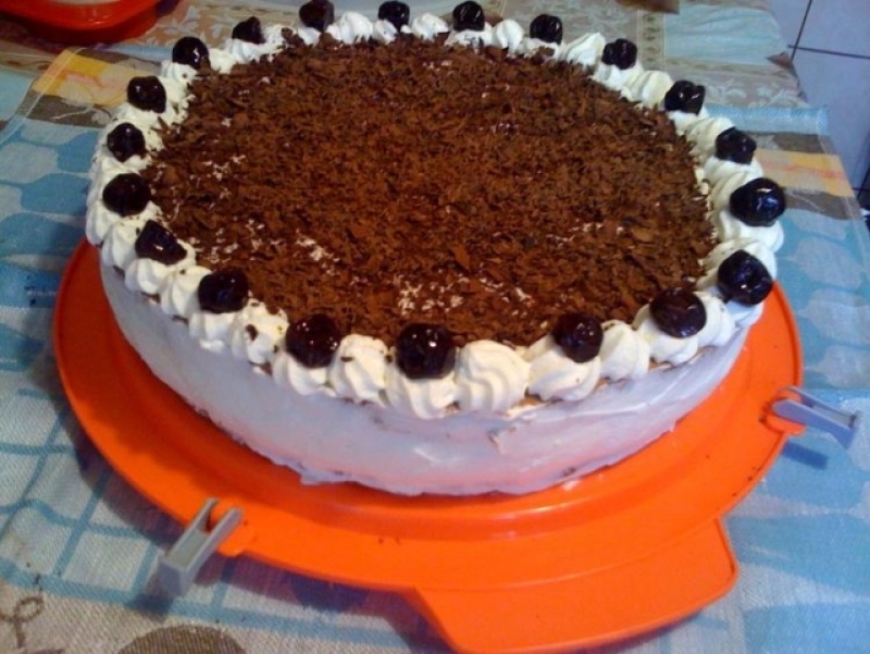 Czekolady rozpuścić w kąpieli wodnej w 100 ml mleka. Kremówkę ubić, dodać rozpuszczoną czekoladę oraz rozpuszczoną żelatynę. Na jeden spód biszkoptowy kładziemy kisiel z wiśniami (można go wcześniej namoczyć kilkoma łyżkami wiśniówki). Przykrywamy drugim spodem biszkoptowym, po czym kładziemy masę śmietanową, a na nią masę czekoladową. Wstawiamy na kilka godzin do lodówki, po czym ozdabiamy.