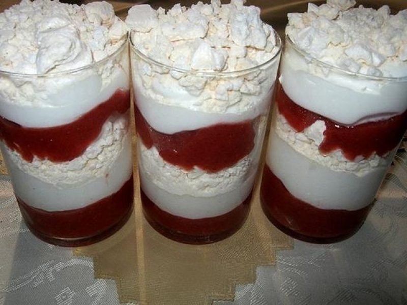 W szklance układać porcjami,najpierw truskawki potem śmietanę i pokruszone bezy