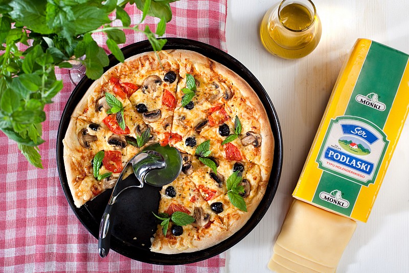 Podstawowym składnikiem, który łączy wszystkie rodzaje pizzy jest ser – bez niego nie wyobrażamy sobie tej słynnej potrawy. Chociaż tradycyjną włoską pizzę przyrządzamy z mozzarellą, to już jej przeróżne lokalne odmiany niekoniecznie. Do wyboru mamy szeroki wachlarz różnego rodzaju serów. – Głównym kryterium przy wyborze sera powinna być jakość. Dlatego szczegółowo przeanalizujmy etykietę, aby wystrzec się produktu z domieszką tłuszczów roślinnych, czyli seropodobnych. Przed zakupem powinniśmy też sprawdzić, jak ser będzie się zachowywał podczas obróbki termicznej i, czy zyska dodatkowe walory smakowe, czy też je straci. Niektóre sery pod wpływem wysokiej temperatury mogą zmieniać smak i zapach na gorszy. Są i takie, które powinno się piec w określonej – nie za wysokiej temperaturze i tylko przez ściśle określony czas. Na pizzy sprawdzi się ser żółty Gouda, ser Podlaski (np. MSM Mońki), to rodzaje odpowiednie do dań na ciepło. Po podgrzaniu dobrze się topią i ciągną, wydobywając smak dania. Jeśli chcemy, aby smak i aromat sera był dominujący, zrezygnujmy z innych wyrazistych dodatków. Amatorzy sera mogą skomponować pizzę z jego kilku różnych rodzajów, tak by tworzyła harmonijną całość. Z powodzeniem można użyć edamskiego lub morskiego. Aby ser łatwo i szybko rozprowadził się na pizzy, dobrze jest go schłodzić w lodówce, a następnie zetrzeć – radzi Ewa Polińska.